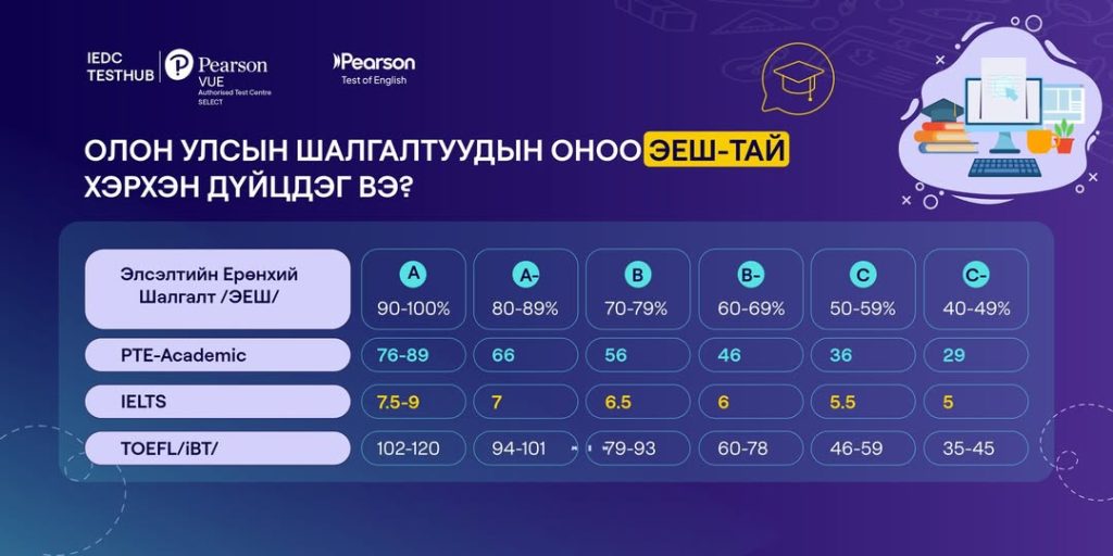 - – Их Британи улсын хувьд Кембрижийн их сургуулиас бусад бүх их дээд сургуулиуд хүлээн зөвшөөрдөг. Их Британийн Засгийн газраас оюутны виз болон чадварлаг ажилчдын виз олгох UKVI Secure English test гэж хүлээн зөвшөөрсөн. Мөн PTE Academic шалгалтыг өгснөөр Chevening тэтгэлэгт хамрагдах боломжтой.